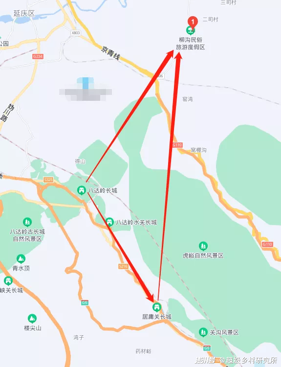 柳沟村位于居庸关正北、八达岭长城东北处,三地以八达岭为顶点,构成一个等腰三角形。