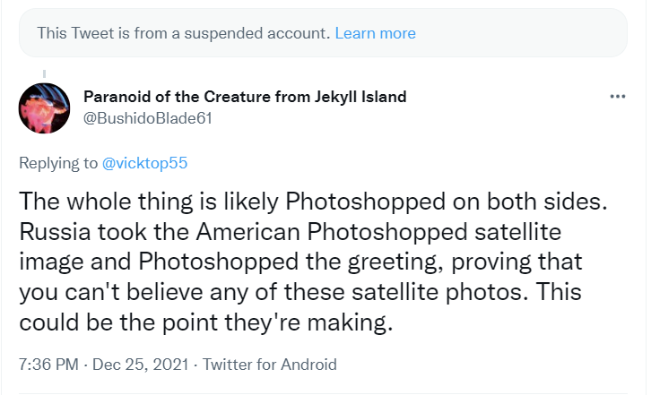 经核查,@vicktop55的账号已被推特停用,但相关推文的回复依然可见。@BushidoBlade61在北京时间2021年12月25日下午7时36分回复@vicktop55,认为此图有PS痕迹,可能经过后期处理。熟悉俄语的推特用户@it4sec在@kirlant的推文下留言:图片中的俄语单词“xуй”有“男性生殖器”的含义,在俄罗斯经常被孩子们写在家附近的围栏上,是一种粗鄙的表达。