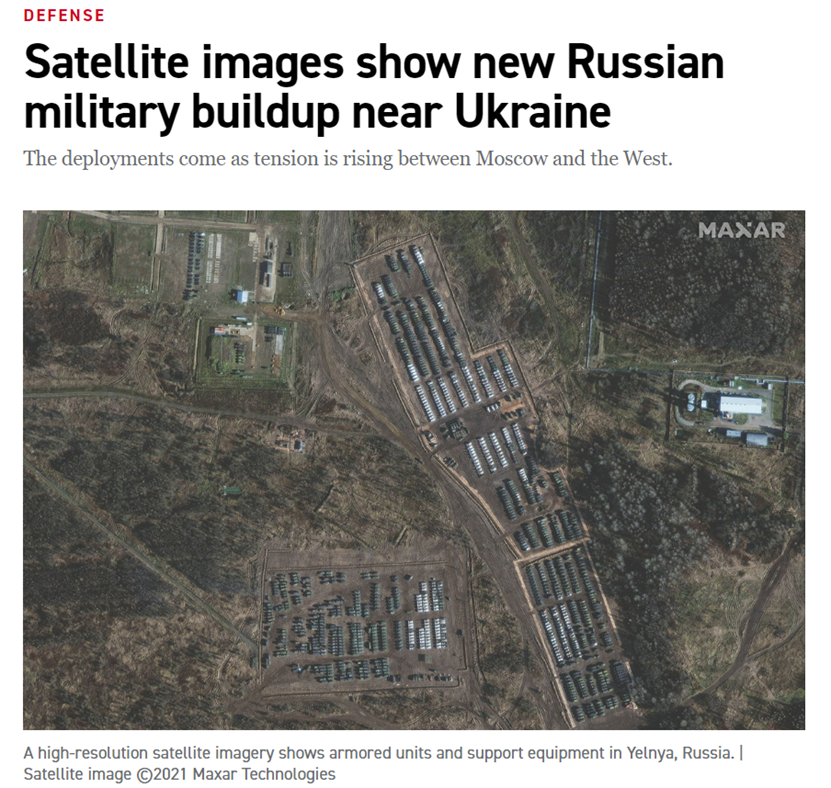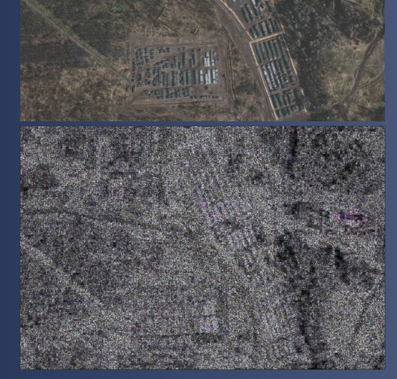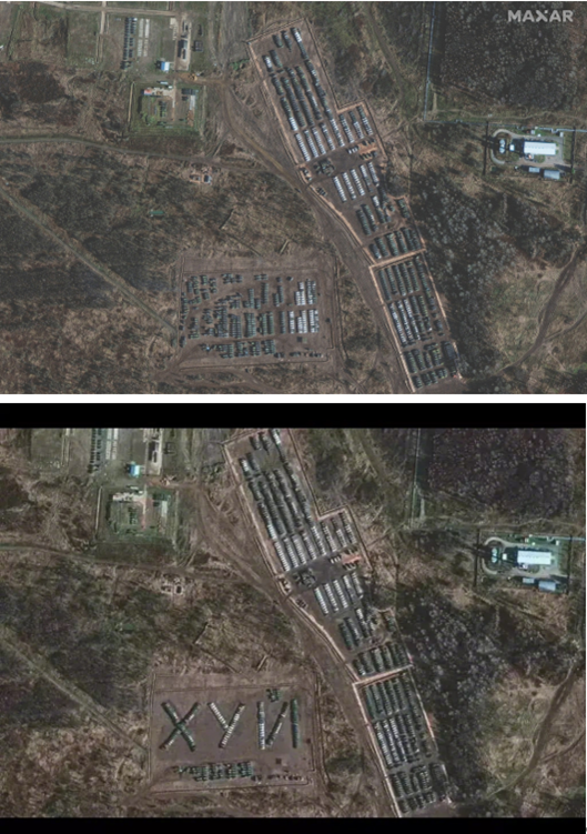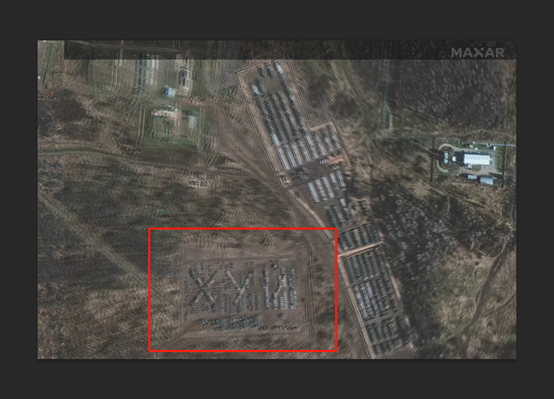 - 此图片与美国卫星公司MAXAR Technology在2021年11月公布的展示“俄罗斯叶尔尼耶地区装甲部队和支持设备”的图片高度相似,但网传图片中下方的装甲设备的摆放形状较原图有明显不同。原图中的装甲设备呈线状分布,而网传图片对此部分进行了PS处理。