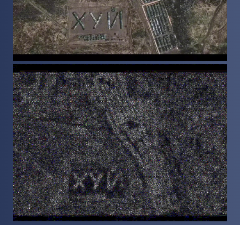 此图片与美国卫星公司MAXAR Technology在2021年11月公布的展示“俄罗斯叶尔尼耶地区装甲部队和支持设备”的图片高度相似,只是网传图片中下方的装甲设备的摆放形状较原图有明显不同。原图中的装甲设备呈线状分布,而网传图片对此部分进行了PS处理,而呈现出“xуй”字符的形状。
