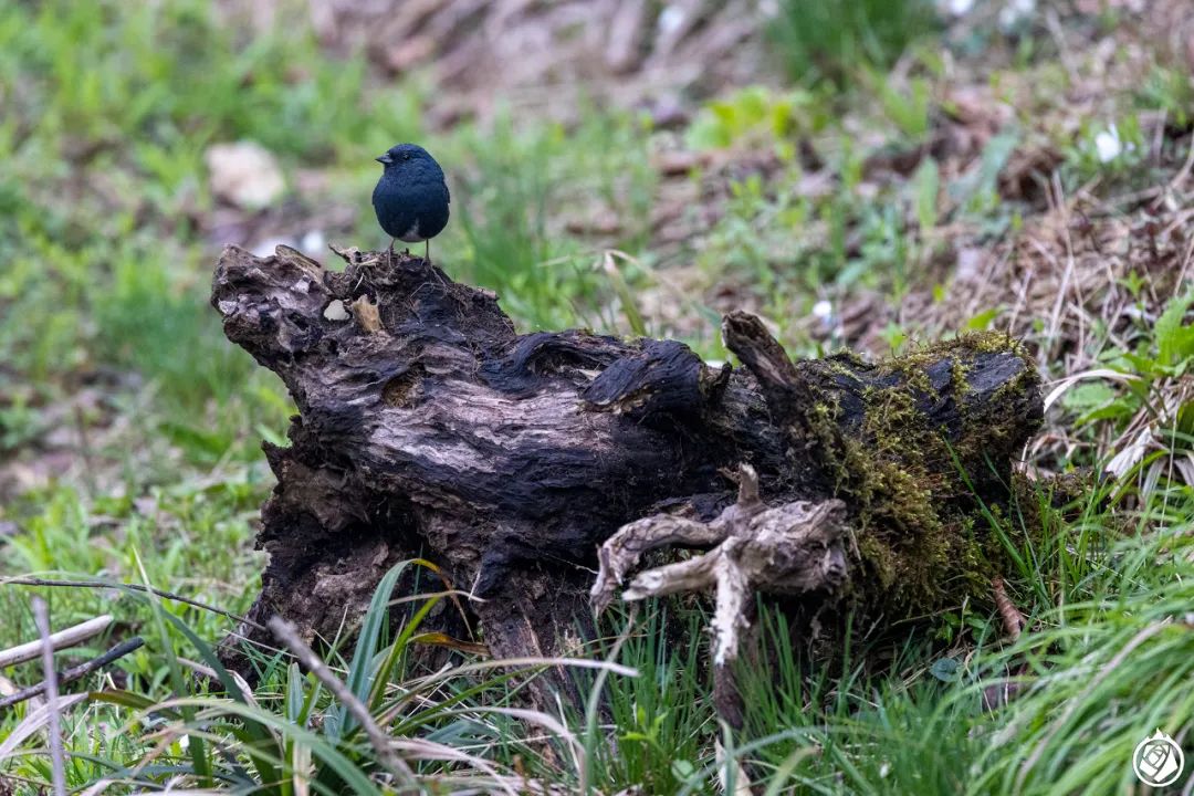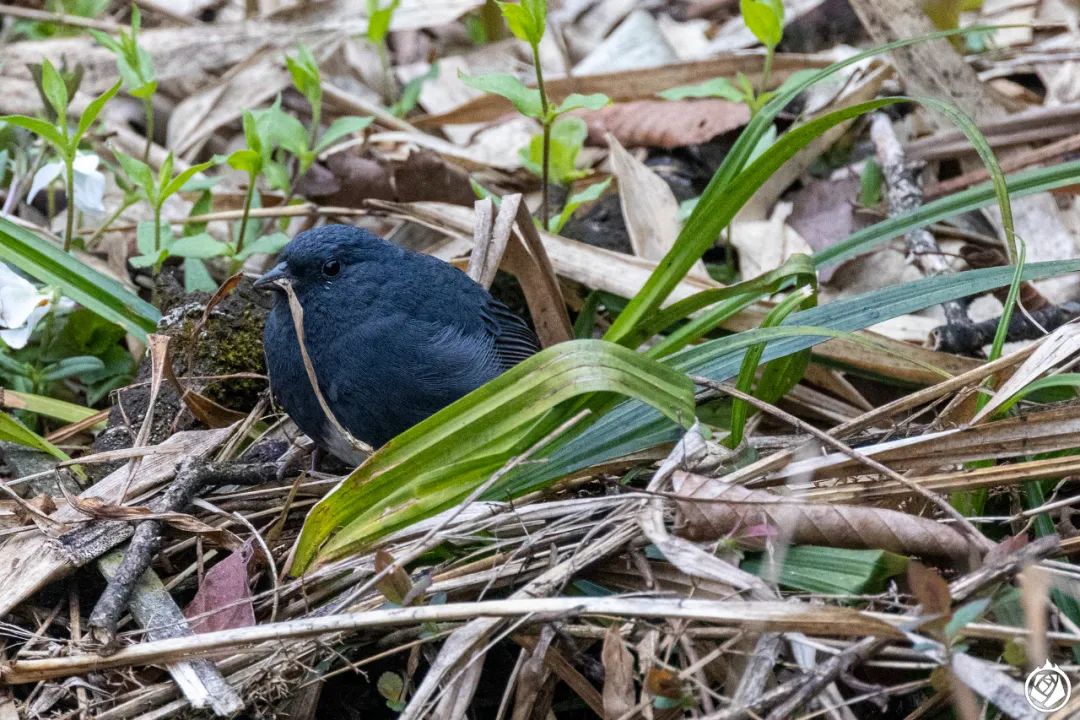 蓝鹀,雄鸟。EOS R5 + RF100-500mm F4.5-7.1 L IS USM,1/250,F/7.1,ISO 3200。另一种比较稳定会出现的,是蓝鹀。蓝鹀是一种喜欢生活在山区的小型鸟类,雄性黑蓝色,雌性褐色,差不多麻雀大小。这种鸟相对少见,我拍下这只雄性个体后,给几位老师看了一看,发现好像还没几个人拍过,于是颇有捡到宝的感觉。