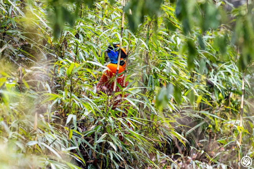 EOS R5 + RF100-500mm F4.5-7.1 L IS USM,1/200,F/7.1,ISO 4000。我还很幸运的拍到了红腹角雉。相对红腹锦鸡,红腹角雉更少见,它们不集群,跑得同样快,依然会利用矮竹林隐藏。我也是在一个大雾弥漫的下午,找到了一只,漫游着的红腹角雉。这个个体脸色很蓝,但肉角未显,大概还没有完全进入发情的状态。