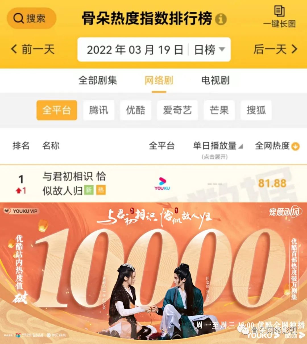 优酷2022重点剧集《与君初相识•恰似故人归》迎来收官。开播后,该剧成为首部在优酷热度破10000的影视剧,在骨朵数据中连续11天霸占热榜第一。