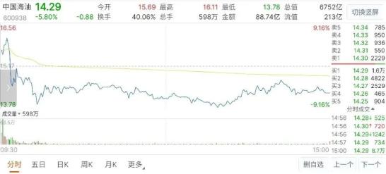 开盘涨势良好,第二日仍然高企不下的中国海油(600938)还是在本周第一个交易日遭遇阻击——开盘先涨后跌,截至收盘14.29元,跌5.8%。