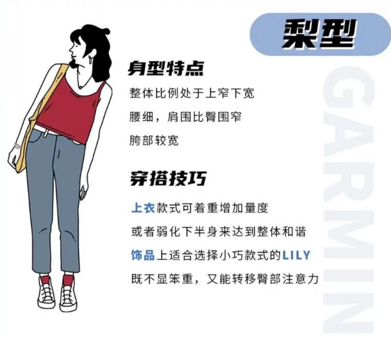 图源小红书:@Garmin佳明A型身材又称为“梨型身材”。肩窄、腰细、臀宽、大腿丰满,上半身不胖下半身胖,这些都是“梨子们”的特点。