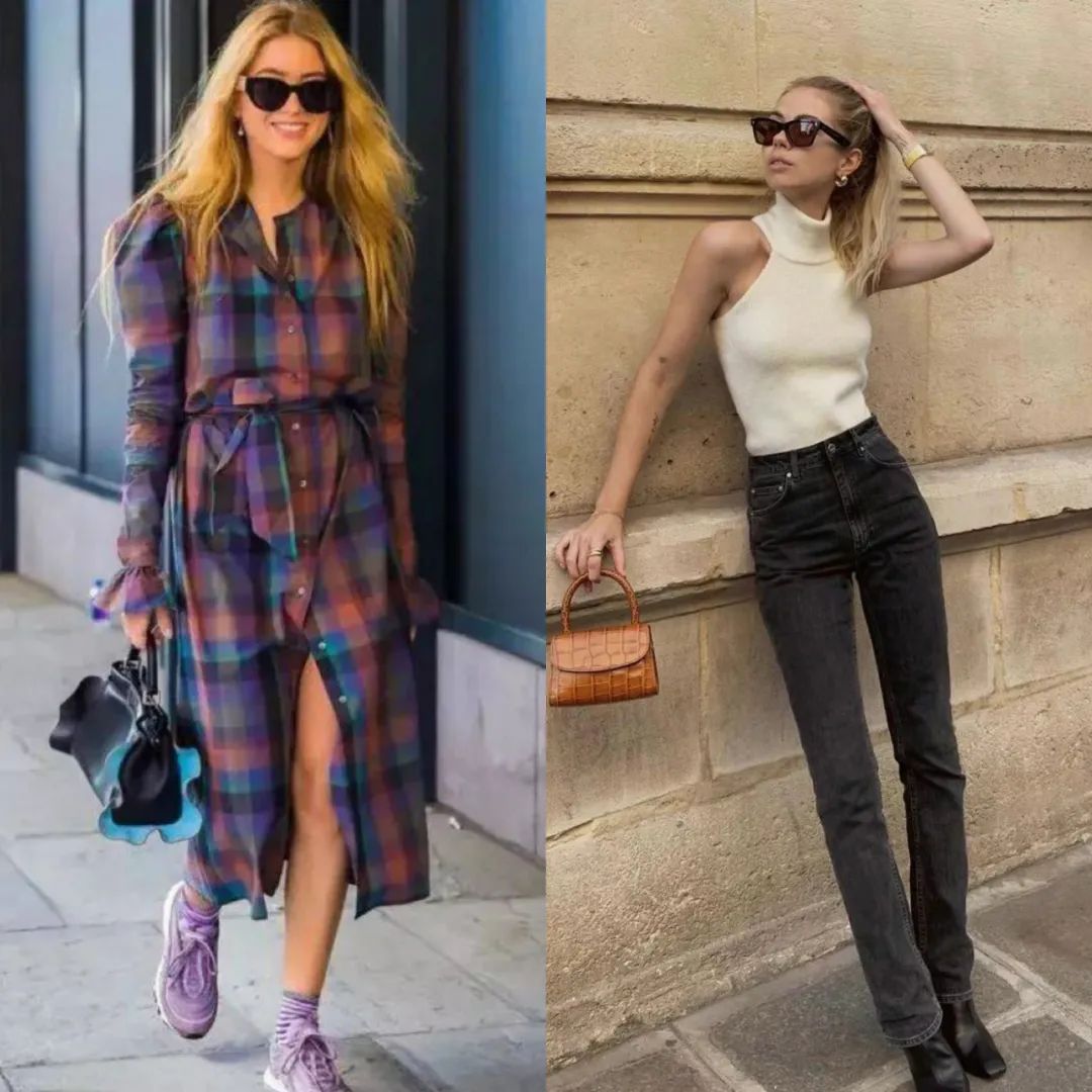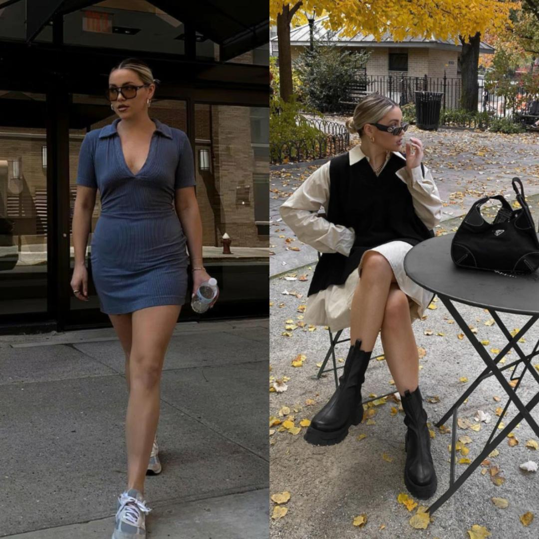 左边这身look,收腰设计的连衣裙让身体看起来更有收缩感。而右边腰带的点缀,让腰线一目了然。