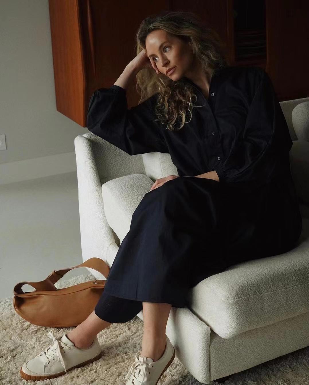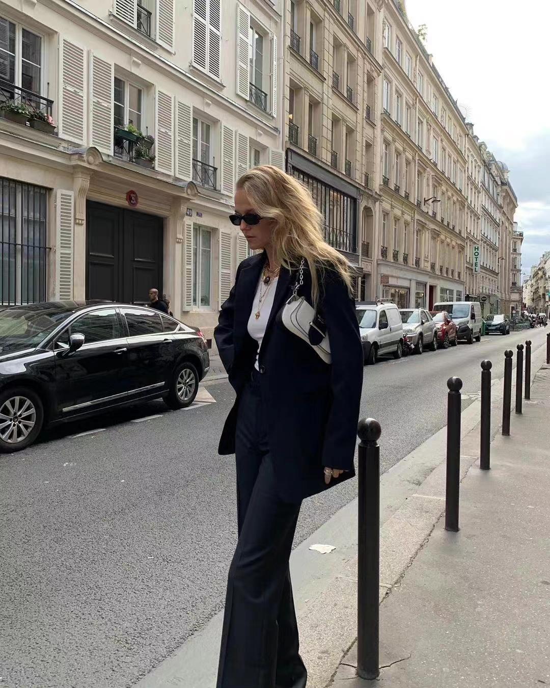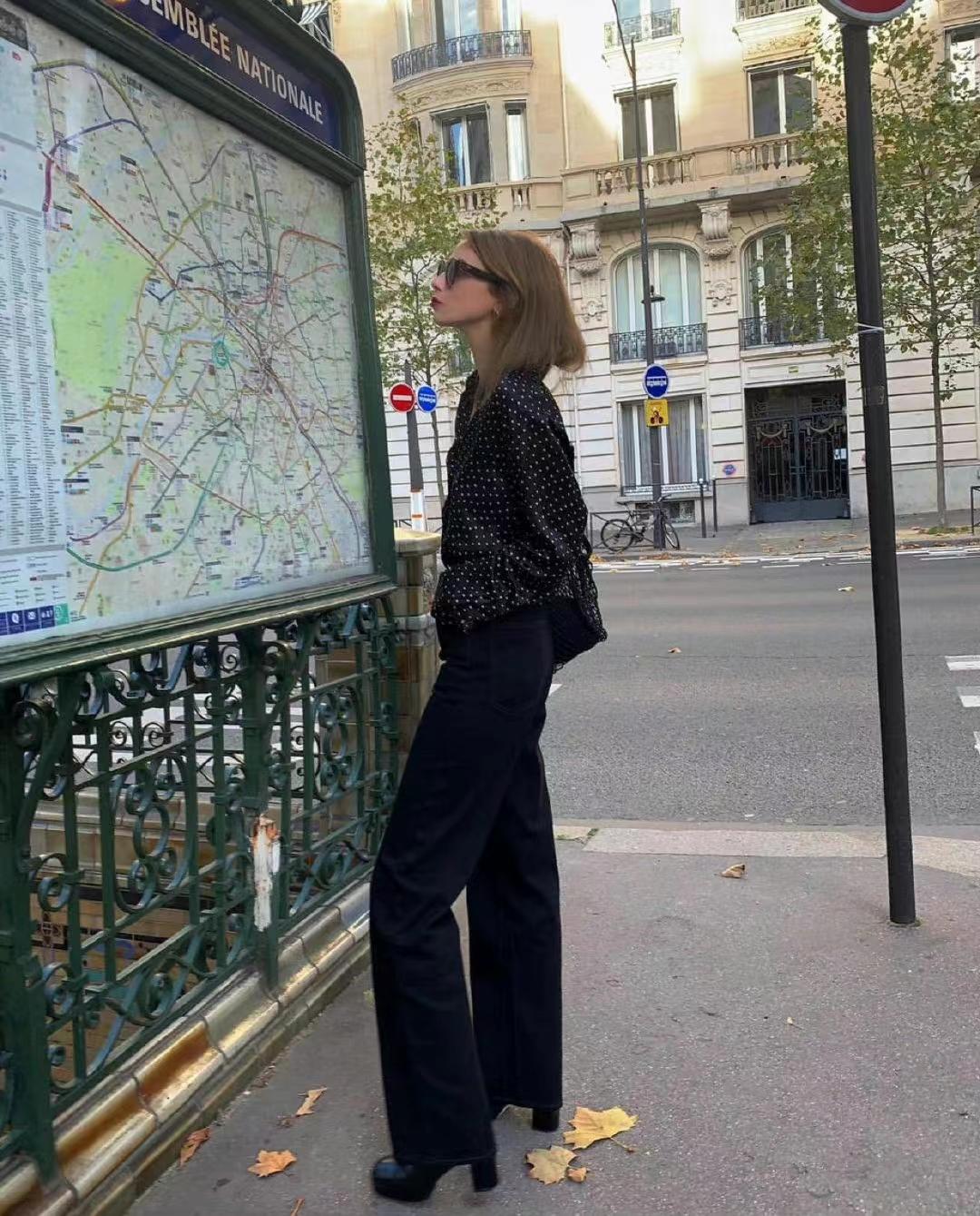 深色的阔腿裤就更合适啦!因为深色系裤子本来就不易占据视觉焦点,又能在视觉上显瘦。