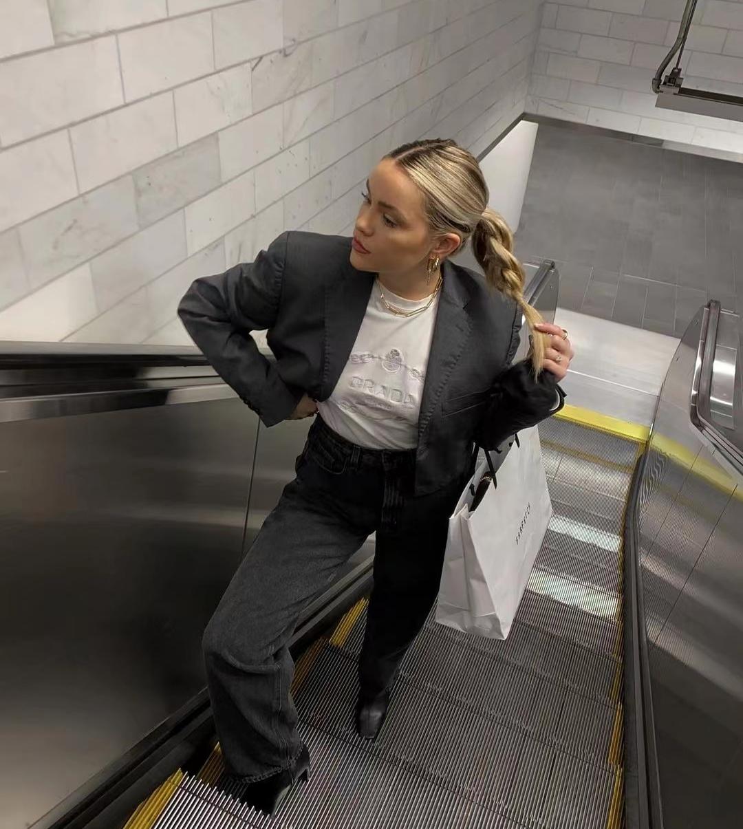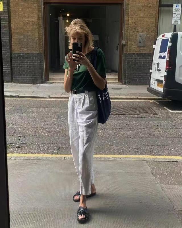 而在裤子的选择上,可以选择臀部宽松的裤子,阔腿裤就是一个很好的参考方案~