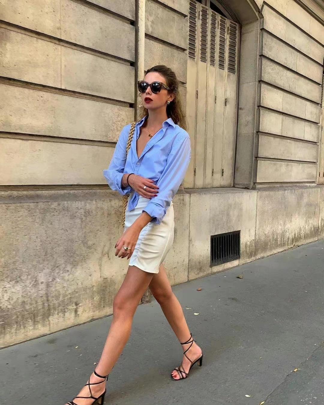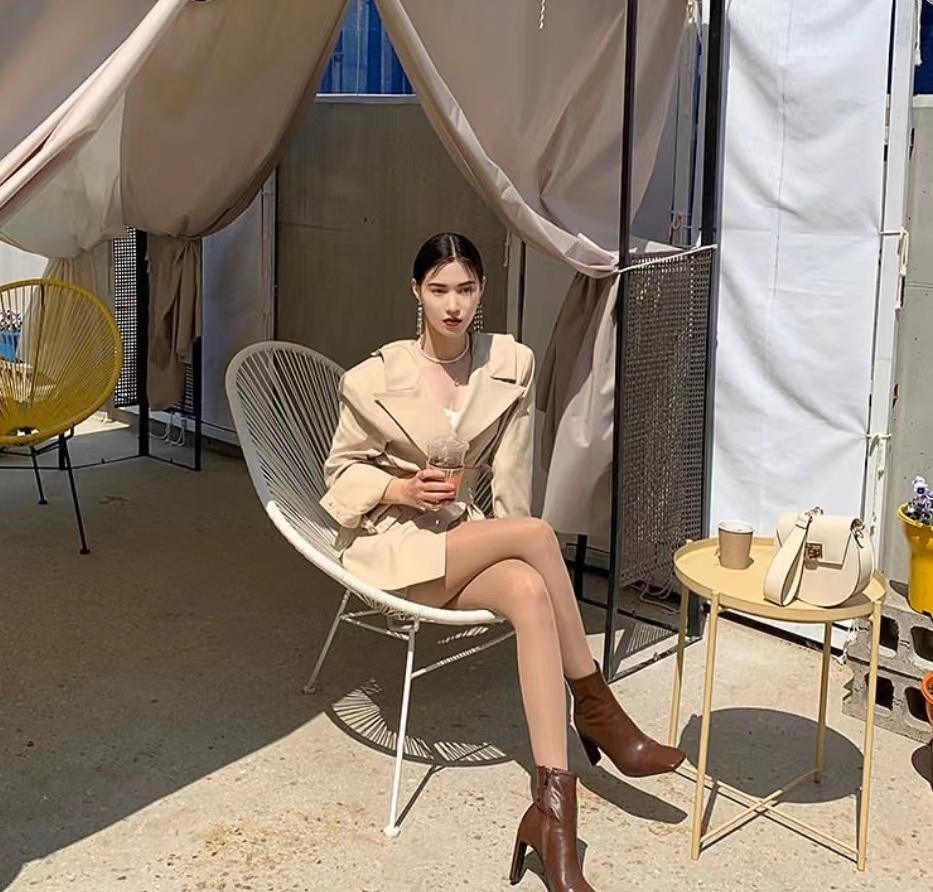 在高跟鞋的选择上,尽量选择细跟的,会更有时髦感和高级感。