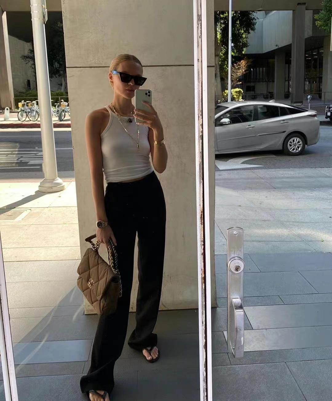 选择垂坠质地的阔腿裤,将分量感转移,而低腰版型的设计,可以自然将胯部线条突出。