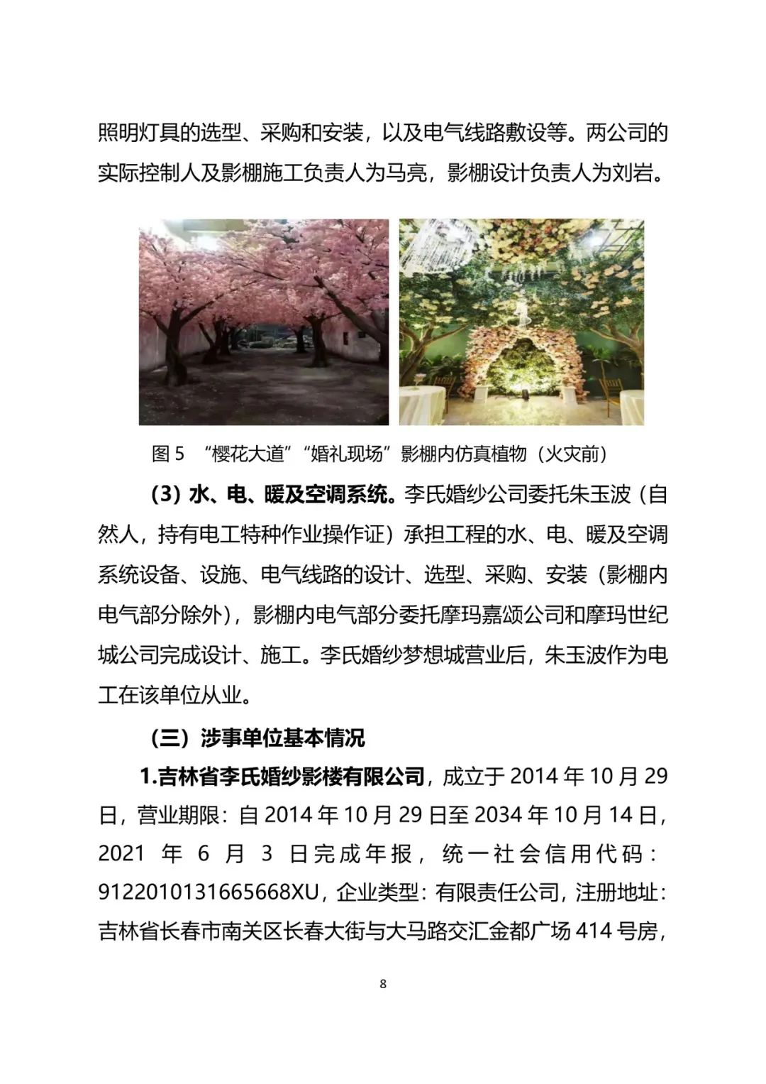 “樱花大道”“婚礼现场”影棚内仿真植物(火灾前)火灾蔓延扩大原因:李氏婚纱公司违规对李氏婚纱梦想城进行改扩建及采用可燃材料装修装饰。