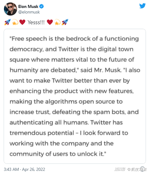 推特董事会通过收购协议后,马斯克在推特上发了篇小作文,大概意思是说,我投资推特不是为了赚钱,是因为我相信推特作为言论自由平台的潜力。