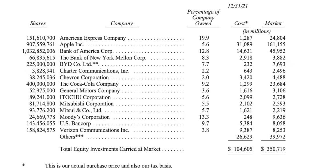 年报显示,公司在持有资产方面,截至去年底前十五大重仓股也一同披露,其中,苹果(市值1611.55亿美元)和美国银行(市值459.52亿美元)居前,其余标的分别是美国运通(市值248.04亿美元)、可口可乐(市值236.84亿美元)、穆迪(市值96.36亿美元)、威瑞森(市值82.53亿美元)、美国合众银行(市值80.58亿美元)、比亚迪(市值76.93亿美元)、雪佛龙(市值44.88亿美元)等。