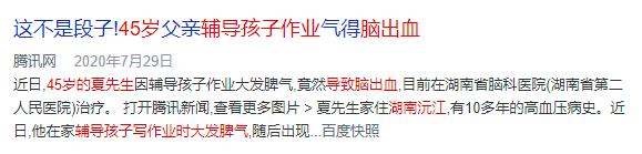 图片来源于网络湖南沅江45岁的夏先生在辅导孩子做作业时,因为孩子表现不佳而大发脾气,导致脑出血不得不入院治疗。