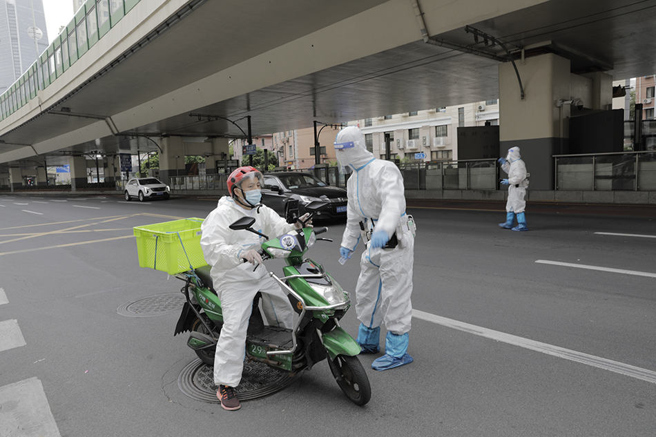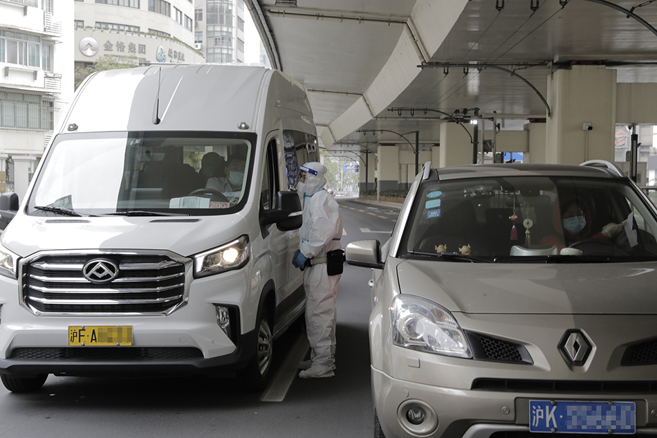 4月28日早上8时许,记者在延安中路镇宁路路口临检设卡点看到,静安公安分局交警支队一大队民警武欣毅在对过往车辆例行检查。一辆红色小货车缓缓驶入路口待检区域,据车辆驾驶员张先生介绍,其系定点配送物资的保供专车。