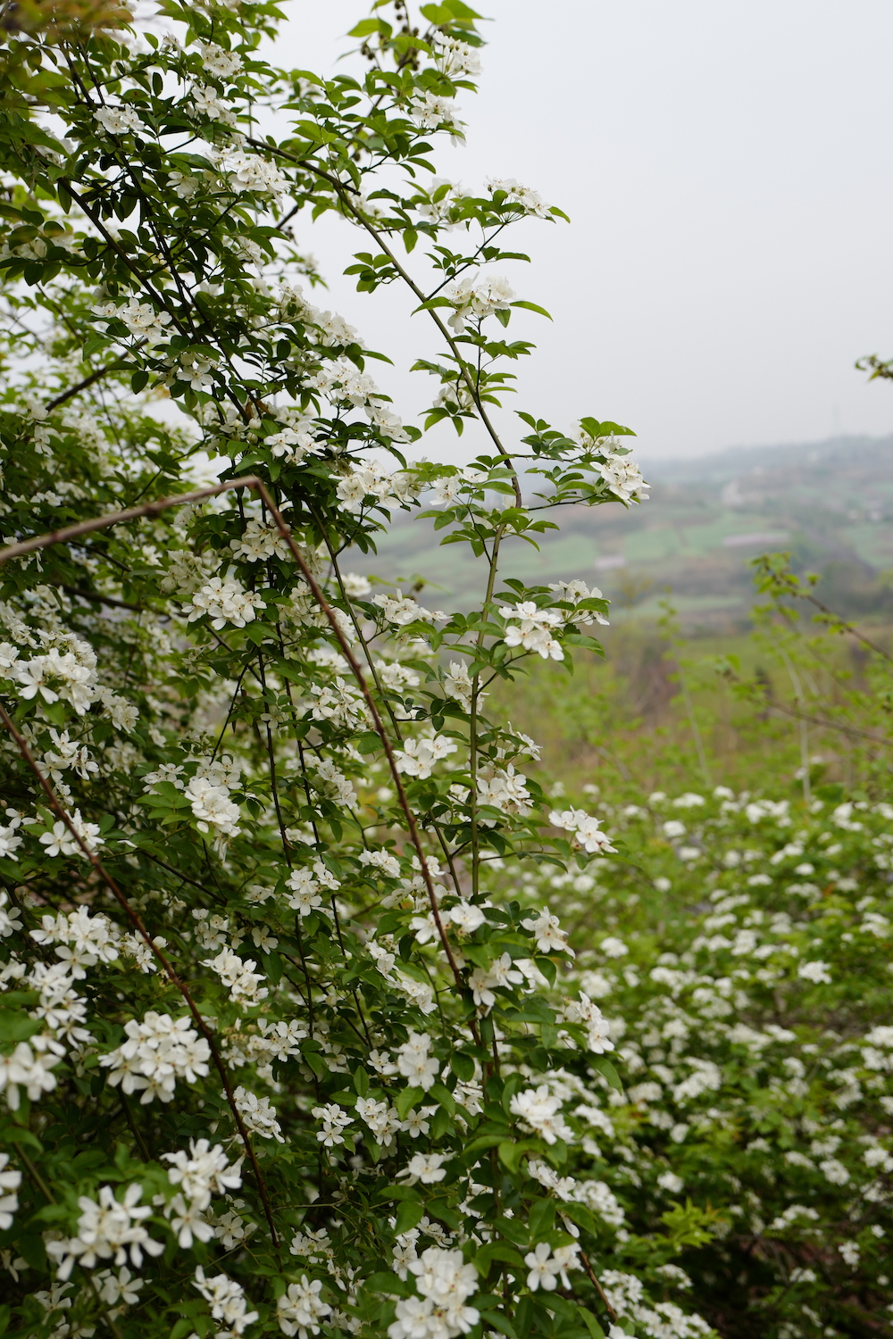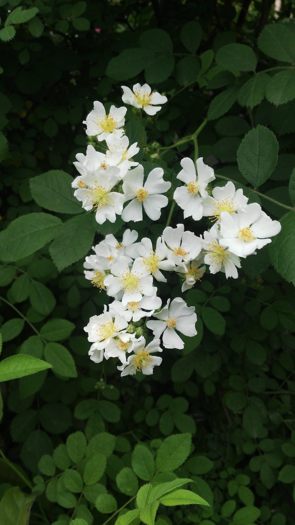 大致勾勒一下荼蘼的样子:植株形态是藤蔓或蔓性灌木,枝条有刺,三枚小叶或羽状复叶,春末夏初开花,花白色,且很香。