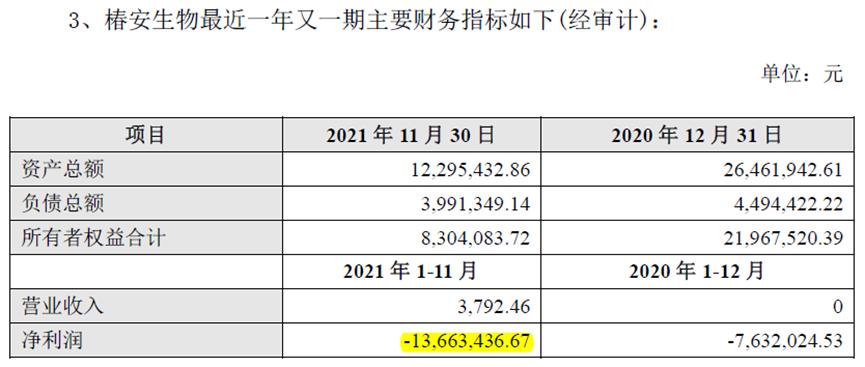长春高新公告然而,椿安生物依然处于亏损状态,2021年前11个月亏损了1366万,是否对得起3.43亿的估值,更何况想要成为长春高新的第二增长点,目前还看不到这个希望。