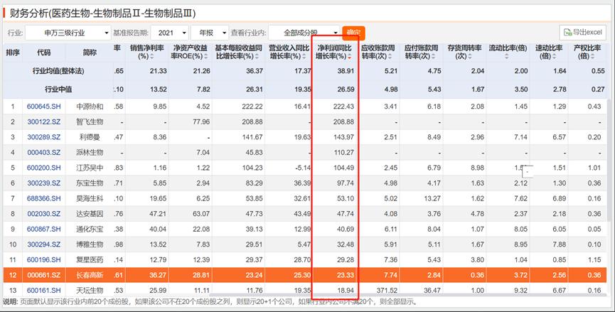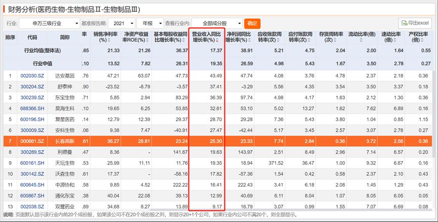 参考申万三级行业(医药生物-生物制品)的可比上市公司,长春高新营收增长率排名第7,中位数为19.35%,同样不俗。