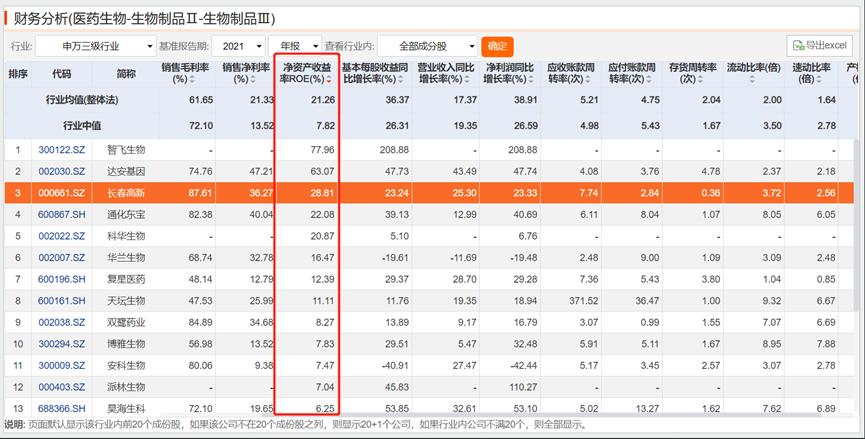 参考申万三级行业(医药生物-生物制品)的可比上市公司,长春高新ROE排名第三,是中位数7.8%的3.7倍。