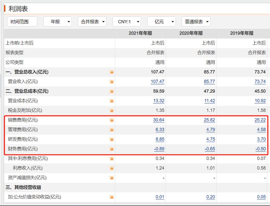 首先是销售费用,2021年增加了4.82亿元,增幅接近19%;然后是管理费用,2021年增加了1.54亿元,增幅高达32%。