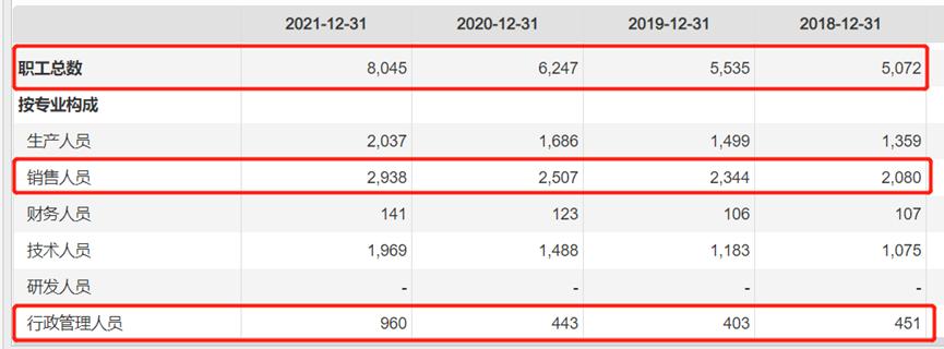 Choice数据截至2021年底,长春高新职工总数达到8045人,增幅达到近29%。其中,销售人员增长431人,增量远高于往年;行政管理人员更是由2020年的443人增加到2021年的960人,翻了2.17倍。
