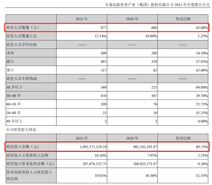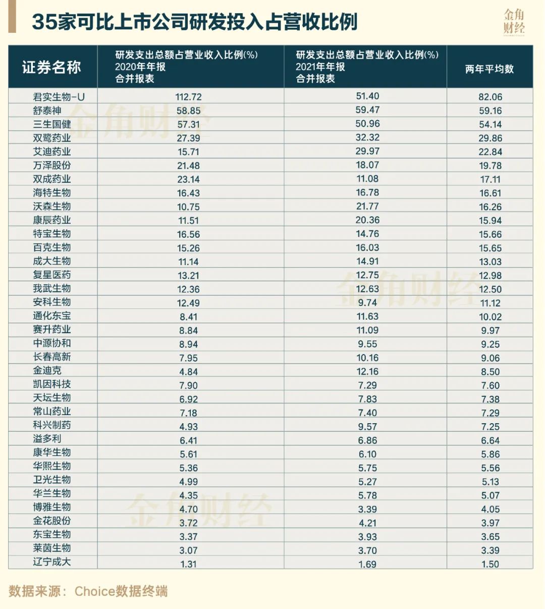 在申万三级行业(医药生物-生物制品)的可比上市公司中,金角财经找出35家披露了2020年和2021年研发投入占营收比例的公司,并对两年平均比例进行排名,长春高新两年平均比例为9.06%,排名第20。