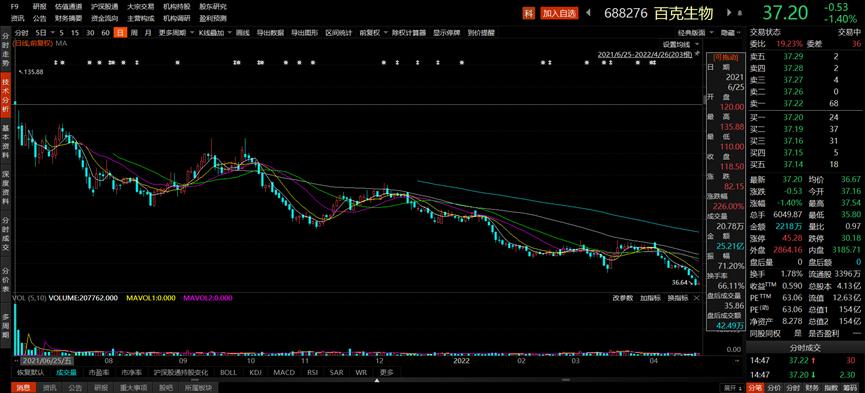 这冲击也反映在股价上,截至4月25日,百克生物由首发日收盘价118.5元下跌到37.13元,跌幅68.7%。