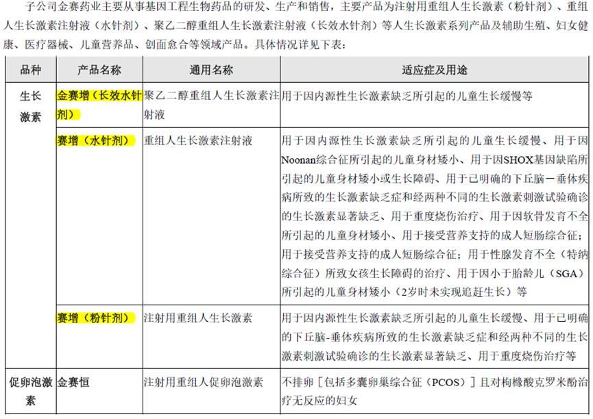 据长春高新年报,金赛药业是国内唯一拥有完整的粉针剂、水针剂、长效水针剂全产品线的生长激素厂商,其长效水针剂为国内唯一的长效生长激素品种。