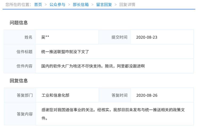 更离谱的是,到了 2020 年,有一个工信部的部长信箱截图出现在了网上,有网友问统一推送联盟咋没有下文了?