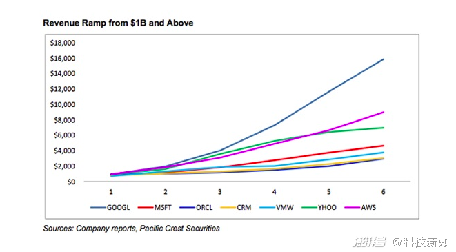 市场分析公司Pacific Crest Securities曾在2014年统计过,如果把亚马逊云服务(AWS)当做是一家独立的科技公司,那么它会是在收入达到10亿美元后增速历史第二快的企业级IT公司,仅次于Google。
