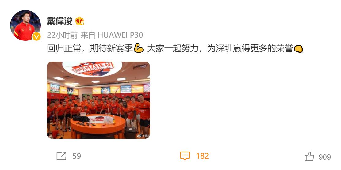戴伟浚本人得知这个消息后也选择接受,傍晚和深圳队内其他大部分球员一样,他在微博上发布了新赛季一起战斗的动态。