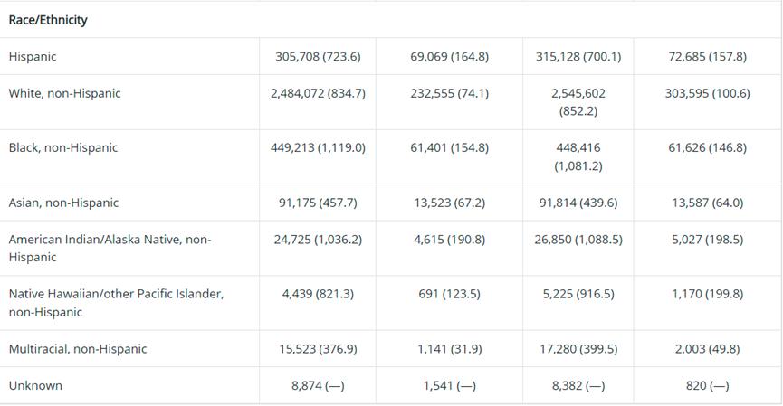 而如果按种族和族裔划分,经年龄校正后死亡率最高的是美洲印第安人、阿拉斯加原住民和非裔人口,亚裔的死亡率较低,死亡人口占全体人口的0. 4396%。