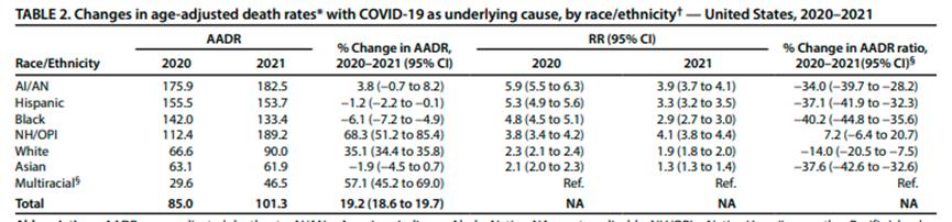 CDC共发布了两份报告,在这两份报告中,CDC通过国家生命统计系统中收集到的死亡报告,计算出了2021年的美国总体人口死亡率,发现某些种族和少数族裔群体之间的死亡率仍然存在差异。但两份死亡统计报告给出的数据,都不能证明亚裔感染了新冠病毒后死亡的概率比其他族裔低。