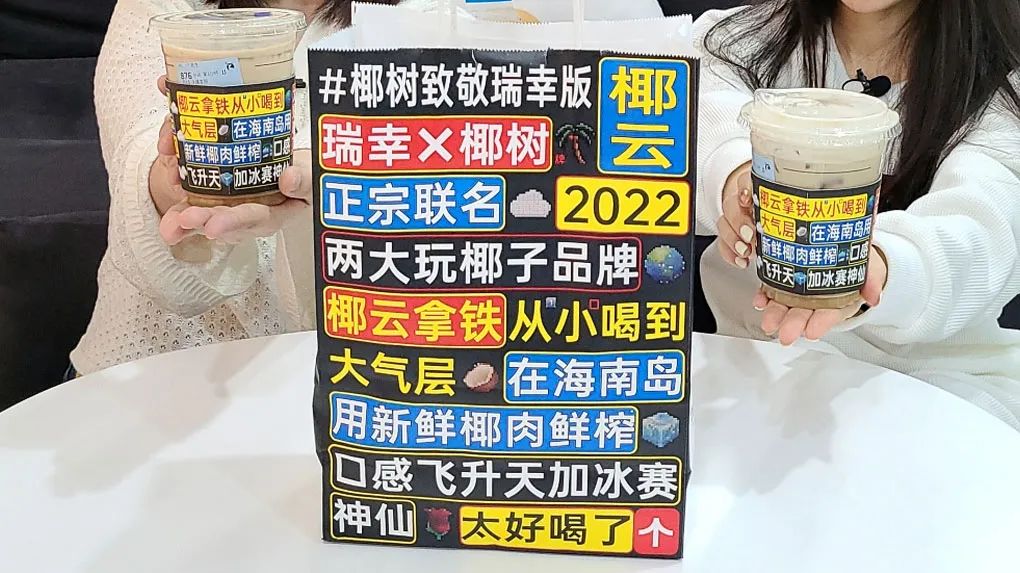 瑞幸和椰树联名的椰云拿铁 | 呲呲 拍摄除了是和椰树牌椰汁的联名赚足了噱头,瑞幸的宣传火力还集中在咖啡上的“椰云”,以下都是原话:“原创瑞幸椰云TM工艺,是椰云不是奶/茶盖,采用神秘科技‘环状分子包埋技术’,用椰浆代替常规芝士奶盖,搅打出如云朵般丰盈细腻的奶沫,是从未体验过的绵密”……小词一套一套的。