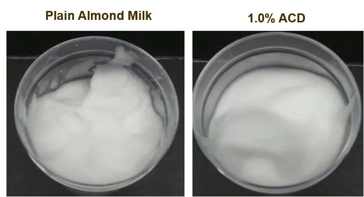 现在出现了这种植物蛋白奶油,能直接打成奶盖 | 图片来自电商平台下图左边是直接用植物奶(杏仁奶)打奶泡,右边是加入了环状糊精后打出的奶泡,更细密、更均匀、体积更大、持久度更高。