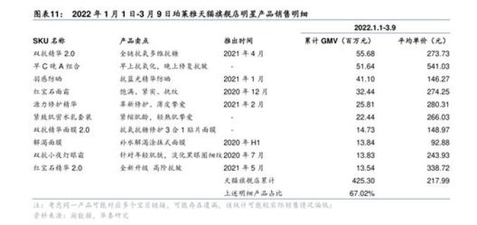 另据华泰证券研报数据,2022年1月1日-3月9日,珀莱雅天猫旗舰店明星产品销售明细中,羽感防晒产品累计GMV达4100万元。