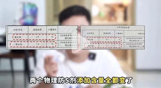 更有博主直接将两个不同批次的“羽感防晒”产品送检,发现两者的物理防晒剂氧化锌和二氧化钛成分含量有明显差异,最近一批次产品物理防晒剂含量提高了3倍左右,这会使产品的肤感下降,并出现假白等现象。