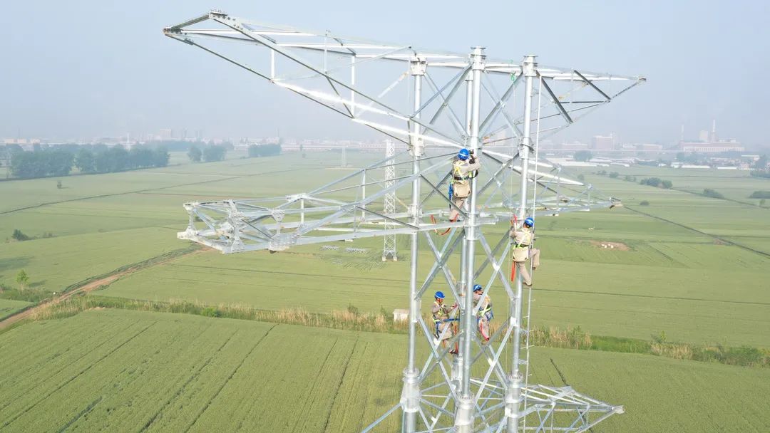 5月1日,在蚌埠市固镇县后郭村,供电工作人员在42米的高空进行组塔作业。