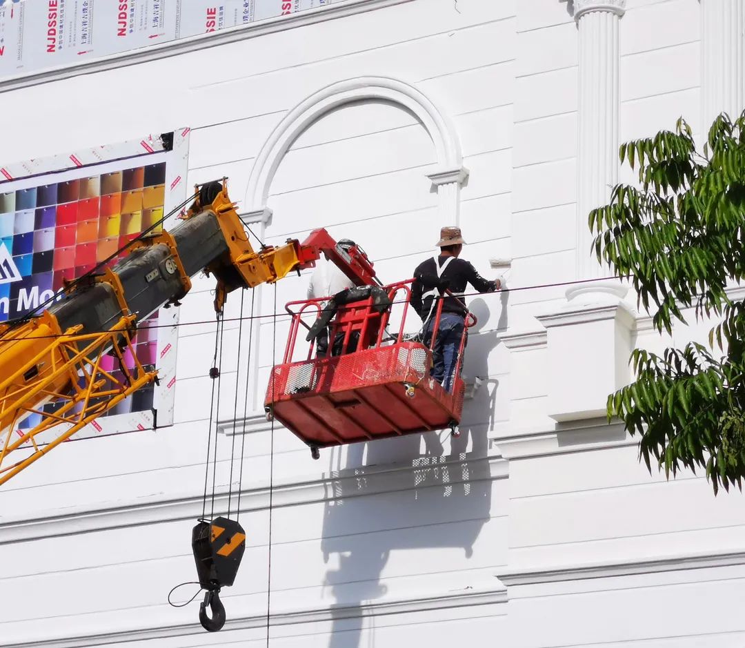 5月1日下午,工农路南段,过节不休息的粉刷匠在吊篮内施工。