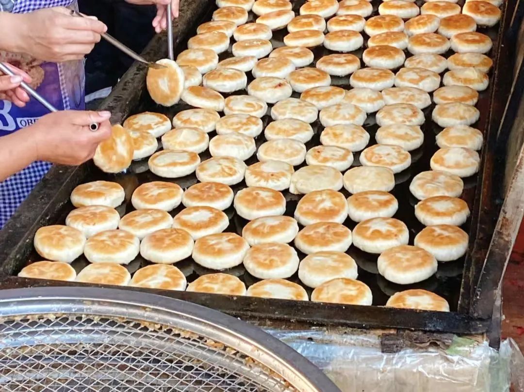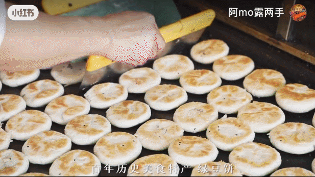 刚出锅的绿豆饼外皮色泽金黄,口感酥脆,伴着芝麻的香气,轻轻咬一口直接被香到!