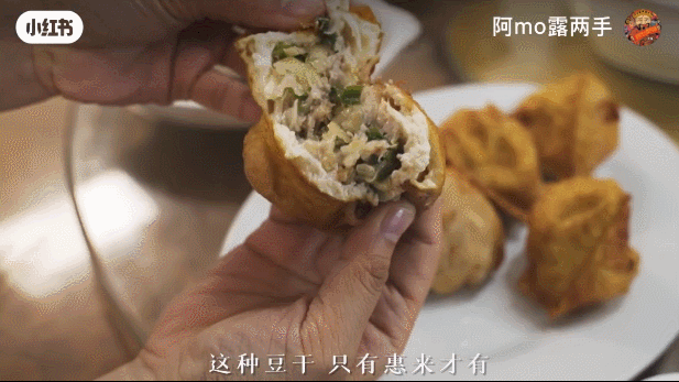 小红书©️ 摄影爱好者小葉肥瘦均匀的猪肉或鱼肉剁成肉泥后加入调料用腐皮裹住,开启油炸模式锁鲜,夹一片送入口中,厚实弹牙又肉香四溢的卷章让人很是上头。