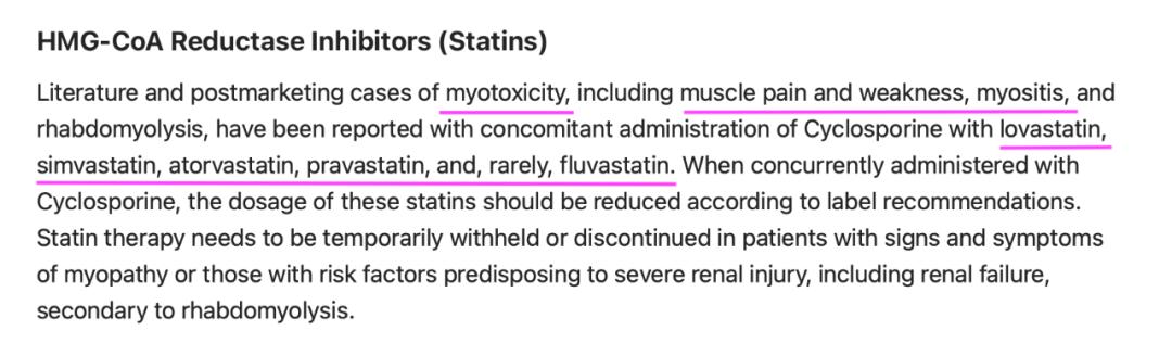 图1. cyclosporin drug information. 图片来源:drugs.com截屏从这个简短的介绍中可以看出环孢素联合使用他汀时,是存在相互作用的,可能会增加他汀类药物发生肌肉毒性的风险。那么众多他汀类药物,环孢素与之相互作用是否有区别呢?下面详细介绍一下。