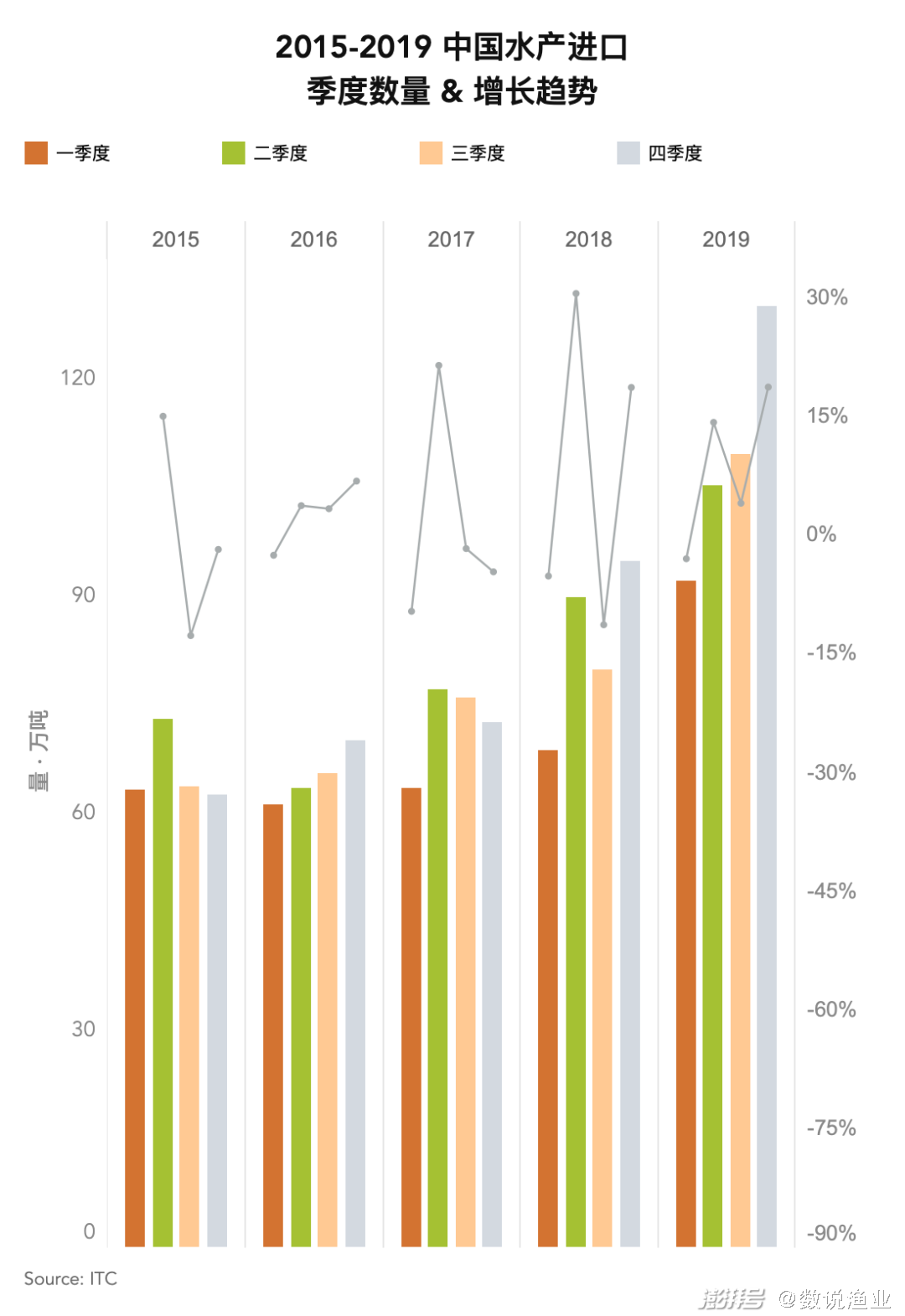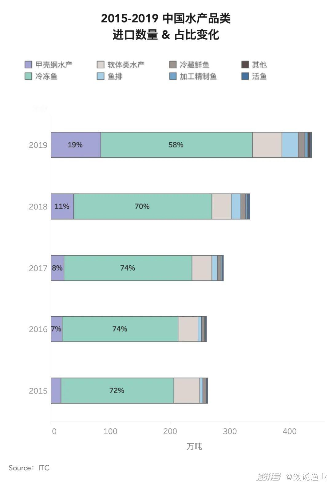 不过随着其他品类尤其是甲壳纲水产的爆发,冷冻鱼在数量占比上逐渐下滑。明星品类甲壳纲在19年的时候增长量达46万吨!不知道是不是因为大家越来越喜欢吃澳洲龙虾和帝王蟹了呢?