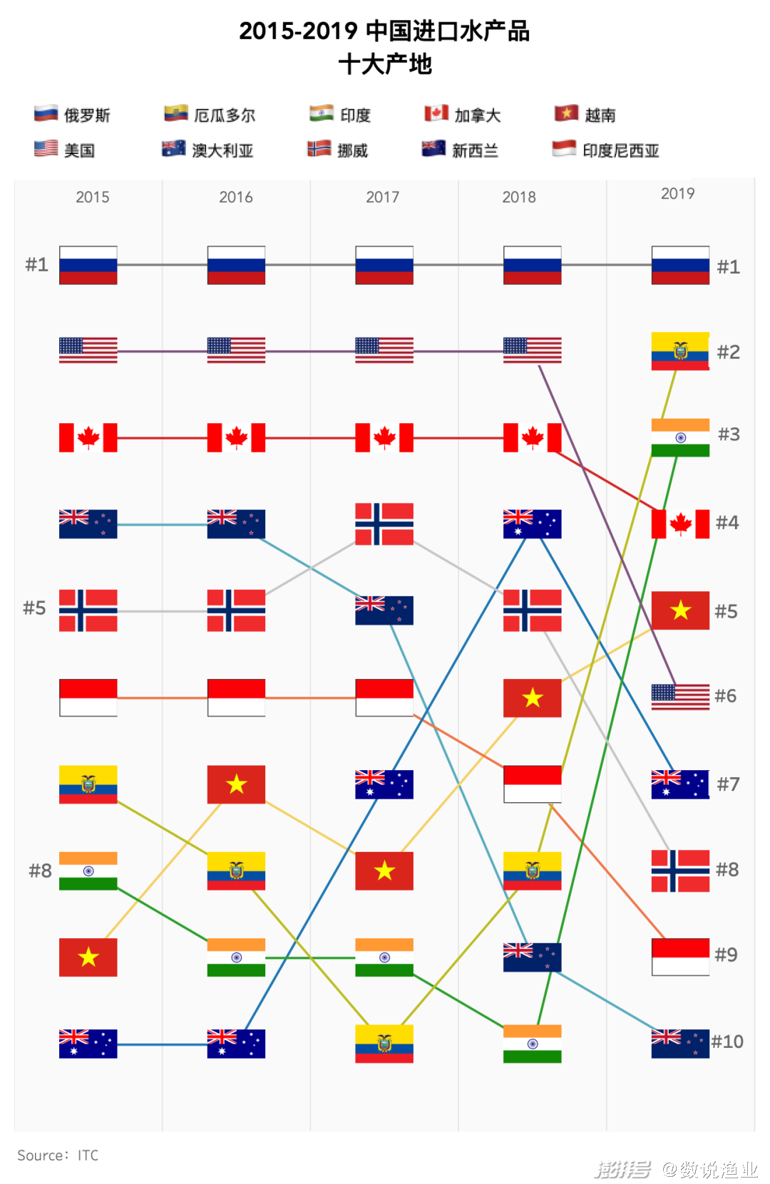 这里我们列出了近5年来中国水产品进口十大产地,以及各自进口数额排名的起起落落: