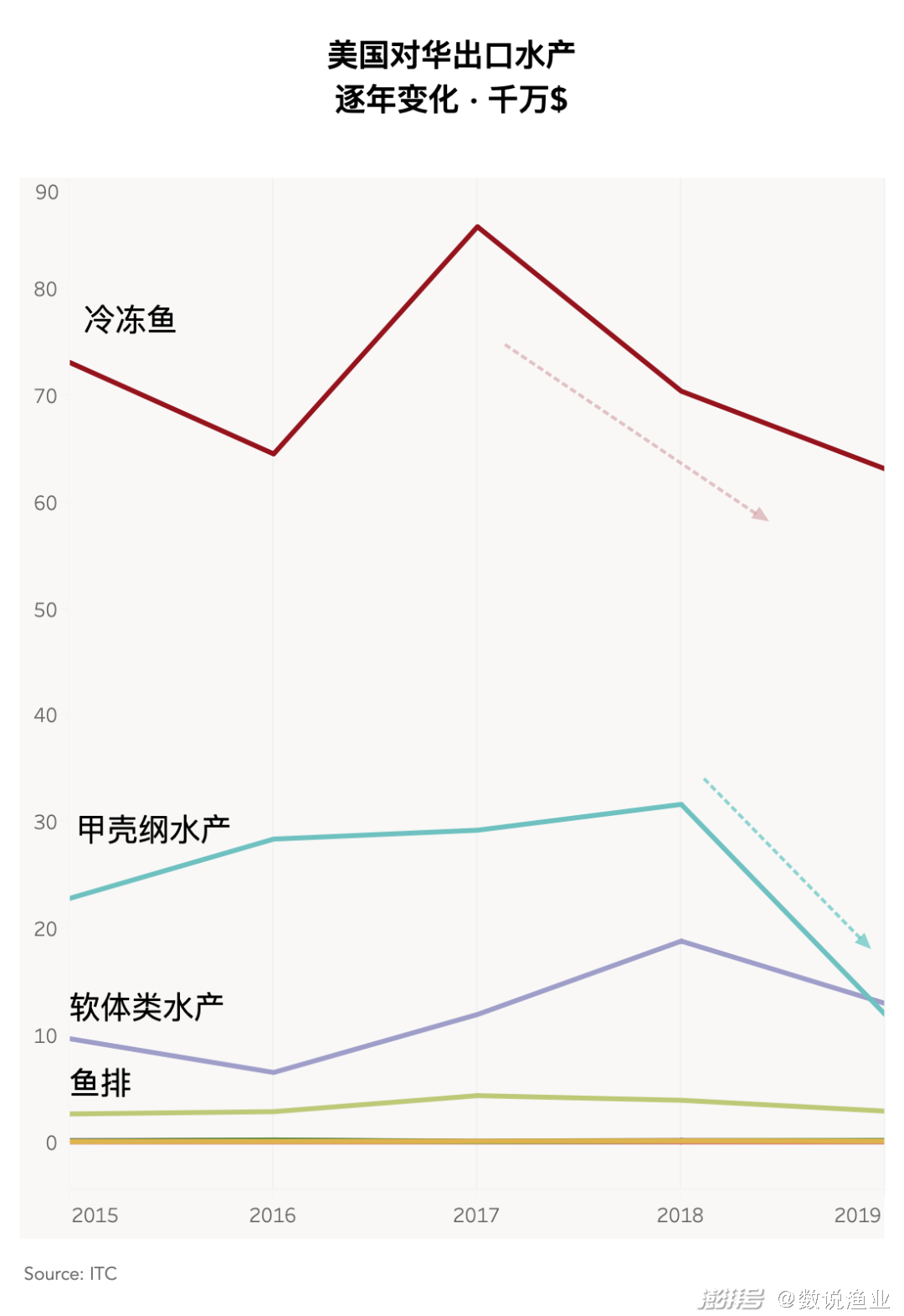 图中显而易见,冻鱼产品占了美国对华水产出口的大头,然而在2018年和2019年,这项对华出口额连续分别下跌了一亿五千万美元、七千万美元。更加严重的是甲壳纲类水产品,在2018年之后出口额径直腰斩,2019年出口额更是同比下跌近2亿美元。这个结果主要还是中美贸易战背景下关税增加所造成。