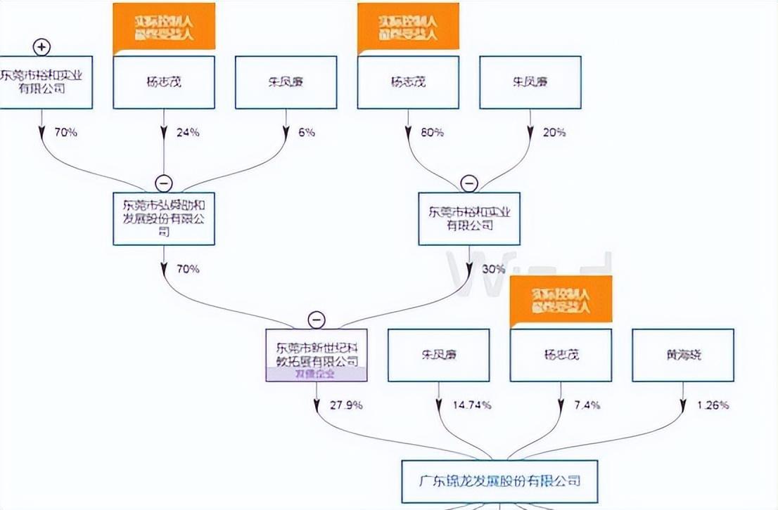 wind数据显示,新世纪公司的股东为东莞市弘舜劭和发展股份有限公司和东莞市裕和实业有限公司,而这两家公司的实际控制人为杨志茂,朱凤廉系其配偶。因此,两人间接持股100%的新世纪公司为锦龙股份的控股股东,杨志茂为锦龙股份的实际控制人,朱凤廉为一致行动人。