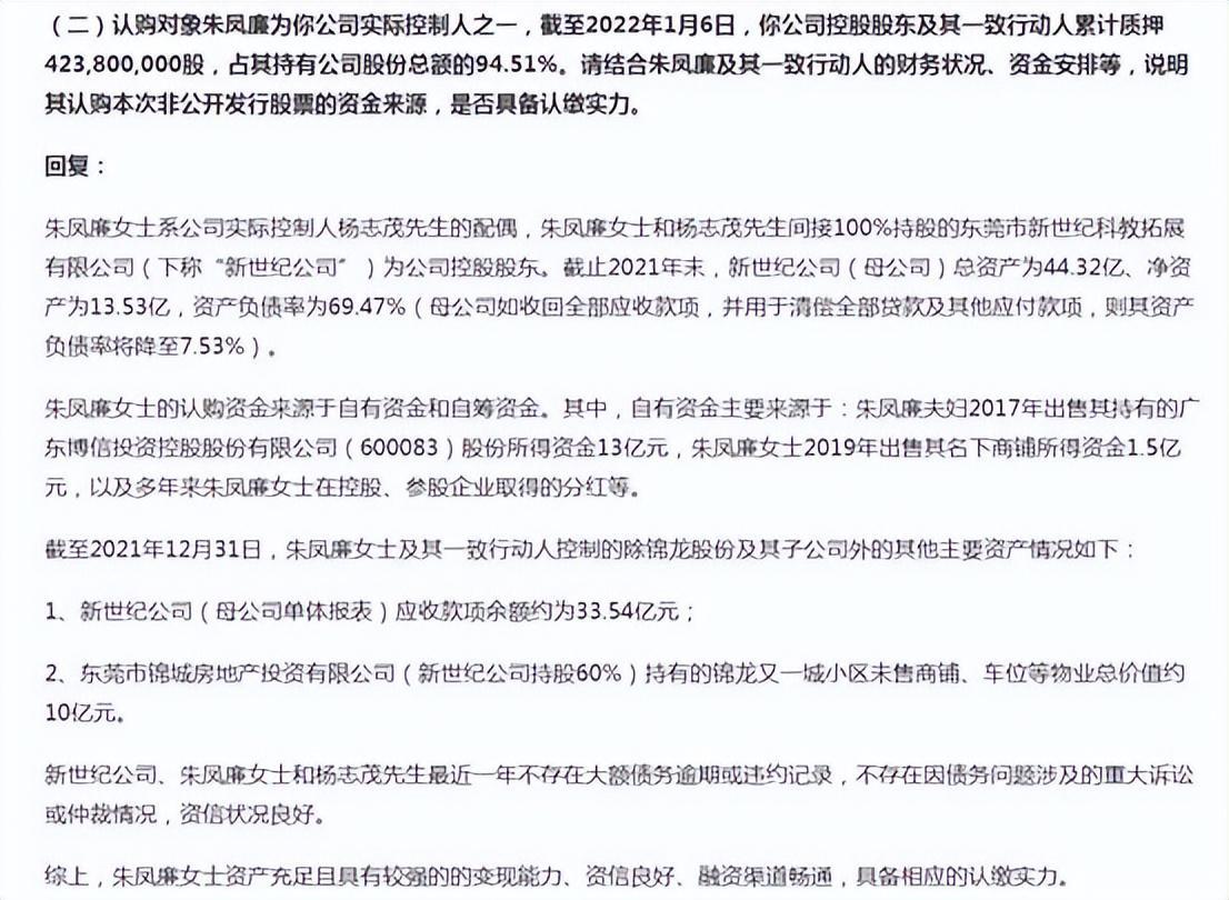 对此,锦龙股份回复称,朱凤廉女士的认购资金来源于自有资金和自筹资金,包括其出售的持有广东博信投资控股股份有限公司股份所得资金、名下商铺所得资金以及在控股、参股企业取得的分红等。朱凤廉女士资产充足且具有较强的的变现能力、资信良好、融资渠道畅通,具备相应的认缴实力。