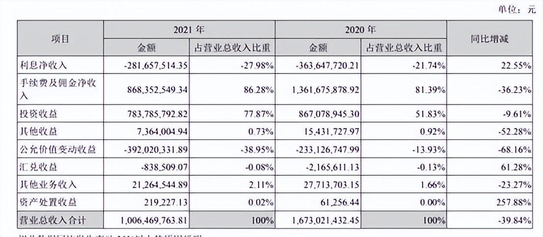 具体来看,2021年锦龙股份的手续费及佣金净收入8.68亿元,同比下降36.23%;投资收益7.84亿元,同比下降9.61%;公允价值变动收益-3.92亿元,同比下降68.16%。