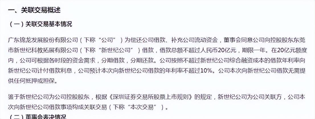 需要提及的是,1月29日,锦龙股份发布关联交易公告,为偿还公司借款,补充公司流动资金,董事会同意公司向控股股东新世纪公司借款20亿元,期限一年,借款的年利率不超过10%。公司本次向新世纪公司借款无需提供任何抵押或担保。