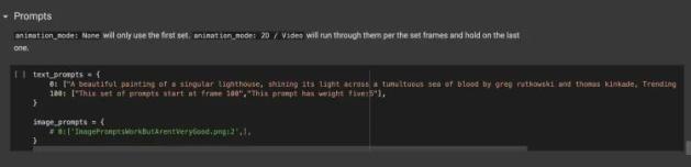 第三部是最关键的,即对所想生成的画作进行描述。打开程序“Prompts”(描述词)部分,初始页面内给出的默认描述词为“A beautiful painting of a singular lighthouse, shining its light across a tumultuous sea of blood by greg rutkowski and thomas kinkade, Trending on artstation.", "yellow color scheme"